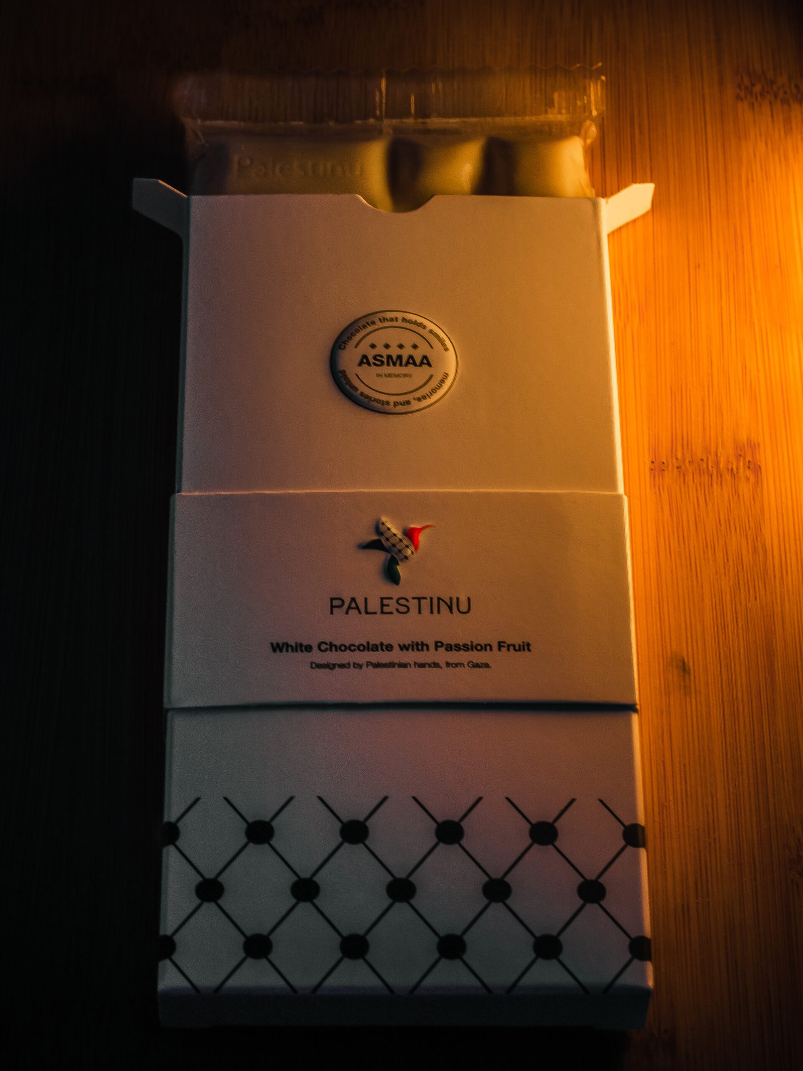 A tropical twist on classic white chocolate. Sweet, creamy cocoa butter blends with the bright, aromatic flavour of passion fruit for an unforgettable sensory experience. A bar crafted by Palestinian hands, echoing the beauty and strength of Gaza.
